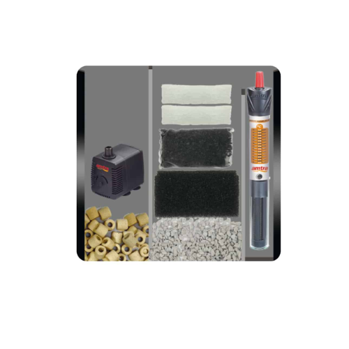 - Komplektā iekļauts filtrēšanas materiāls: balta šķiedra priekšfiltrācijai – aktivētā ogle – melns sūklis mehāniskai filtrēšanai – saķepināti stikla akmeņi un īpaši poraini keramikas cilindri baktēriju apdzīvošanai;