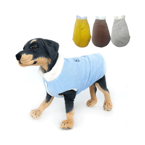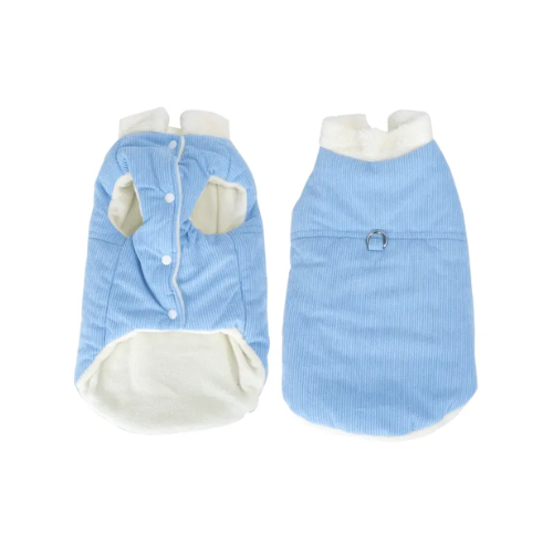 Siltinā jaka suņiem ar pogām. Iekšpusē silta flīsa odere. Uz muguras iestrādāts metāla gredzens pavadas stiprināšanai.