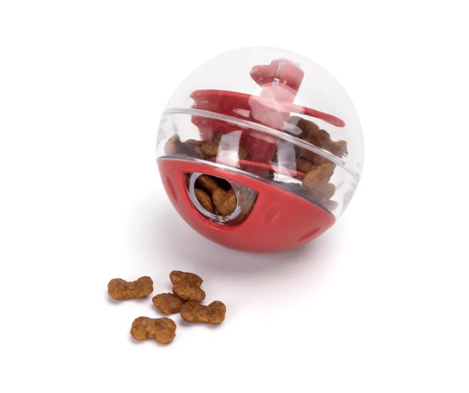 Kārumu bumba kaķiem. Barības dozatora bumbiņu var izmantot kārumu vai barības granulu ievietošanai, lai kaķis varētu ēst spēlējoties. Izgatavota no augstas kvalitātes materiāliem.
