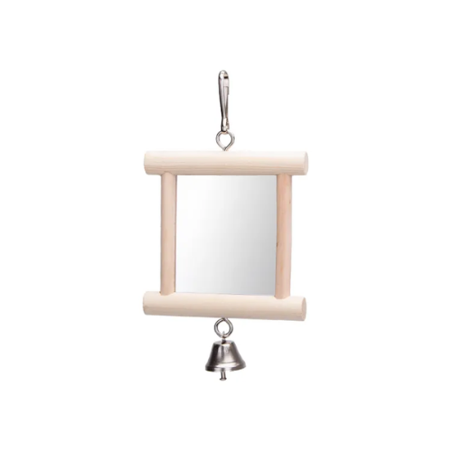 Putnu stikla spogulis ar koka rāmi, ar āķi un zvaniņu.