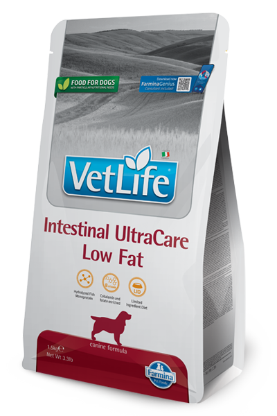 Farmina Vet Life Intestinal UltraCare Low Fat ir kompleksa diētiskā barība suņiem absorbcijas/uzsūkšanās traucējumu mazināšanai zarnās, nepietiekamas gremošanas kompensēšanai un eksokrīna aizkuņģa dziedzera mazspējas gadījumā.